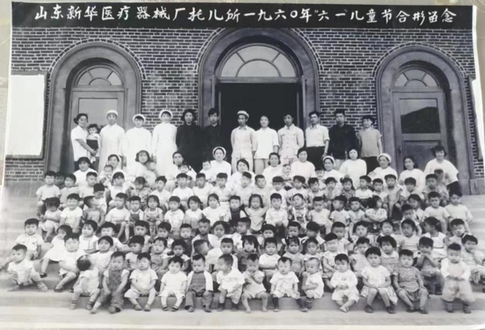 1960年,新华医疗器械厂托儿所欢度“六一”儿童节合影,后排左一为刘若梅。