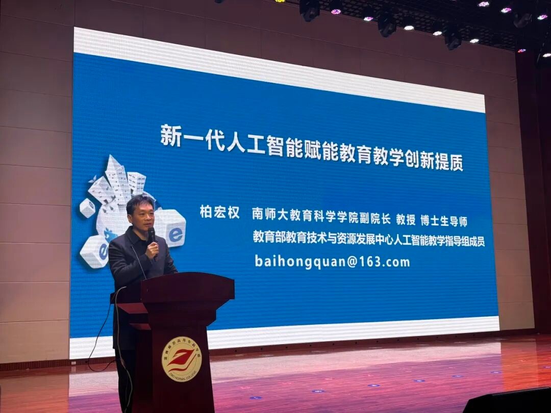 上午,会议邀请南京师范大学教育科学学院副院长柏宏权教授作专题报告。柏教授以《新一代人工智能赋能教育教学创新提质》为题,围绕人工智能如何赋能日常教学展开,通过提示词工程、资源获取与修改、学情分析、作文自动批改等实际案例,展示了AI在减轻教师负担、提升教学效率的作用,强调人工智能推动教育理念转向“学生中心”、促进个性化学习,指出未来教育关键在于“人机协同”,掌握AI技术的教师团队将成为学校的核心竞争力,内容务实、富有启发。