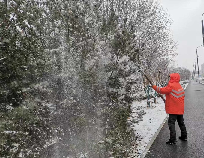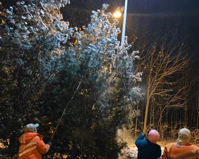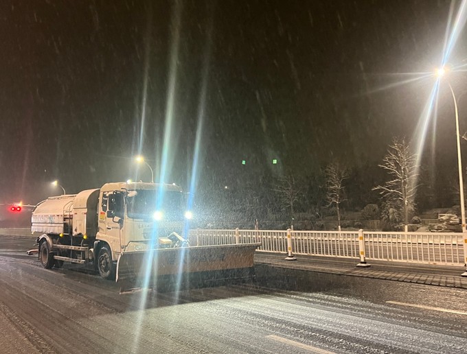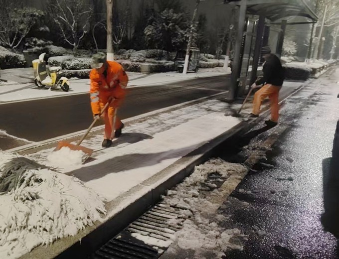 降雪开始,除雪作业迅速行动。3台融雪撒布机率先出动,沿辖区主要干道不间断循环撒布融雪剂,从源头抑制路面结冰;针对桥梁、坡道等易结冰、通行风险高的关键点位,市政工作人员同步开展人工精准撒布作业,强化防滑防冻效果。12日晚11时,路面开始积雪,提前待命的大型除雪车辆迅速投入战斗,采用滚刷清扫与雪铲推雪相结合的作业模式,实行“人歇车不歇”轮班制,高效清扫主次干道积雪,保障道路达到通行条件。13日凌晨3时,除雪先锋队率先到岗,重点对学校、医院、公交站点等人员密集区域开展人工除雪;进行全域除雪作业,针对树木积雪及时击落,防范断枝隐患。截至目前,本次降雪累计投入应急人员1200余人次,调配滚刷、雪铲、撒布机等大型除雪设备20余台,撒布融雪剂40余吨,全方位保障道路通行安全。