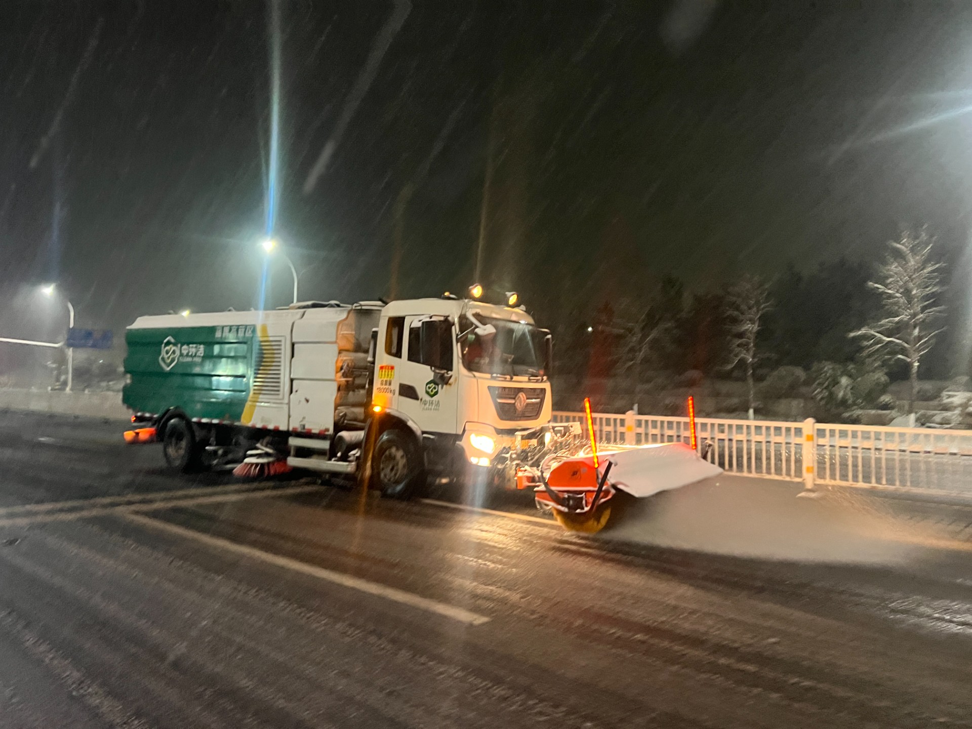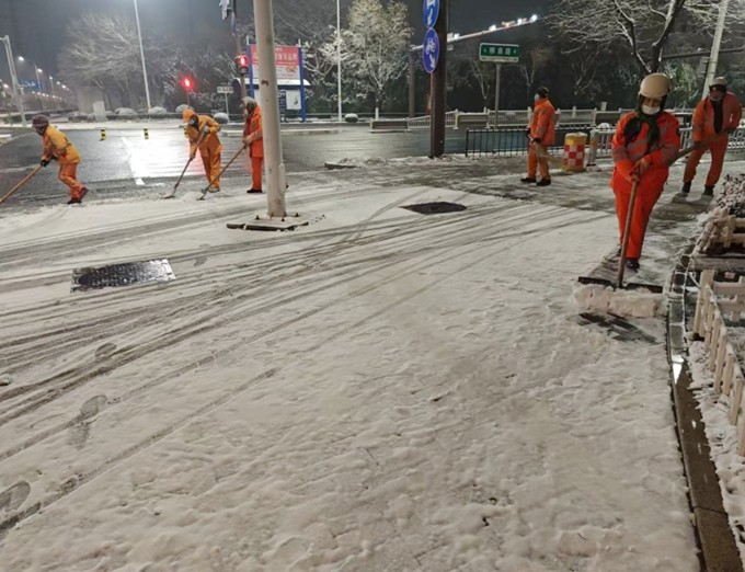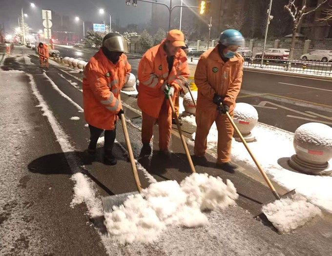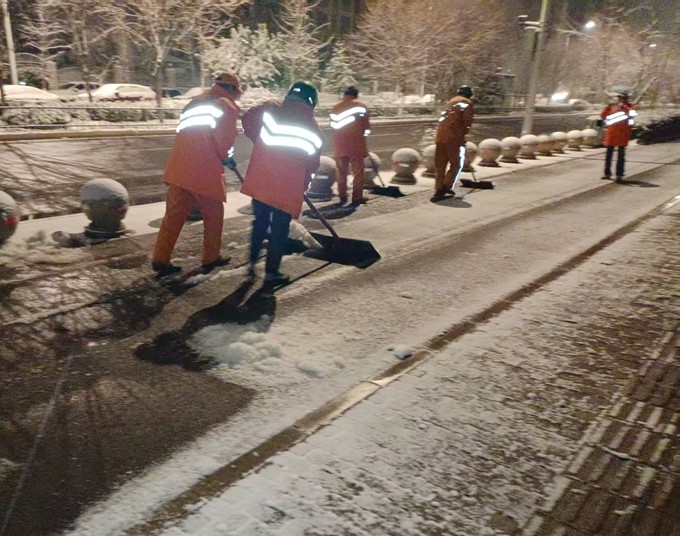 同时按照“雪中通、雪后净”的时效性原则,以“机械除雪为主+人工辅助”组合作业模式,轮班作业,累计出动大型除雪设备22台。随降雪第一时间出动3台撒布机,按作业路线由主到次有序撒布融雪剂,优先保障桥梁、坡道,14台雪滚10点全面出动,逐一清理高新区主次干道,5台雪铲配合雪滚收尾;人工除雪应急队伍凌晨3点上岗,主要清理人行道和非机动车道积雪,优先保障平交道口、学校、医院等重点点位。所有员工5点上岗,分片区出动巡查小组,不间断巡查各个路段清理情况,确保积雪及时清理。