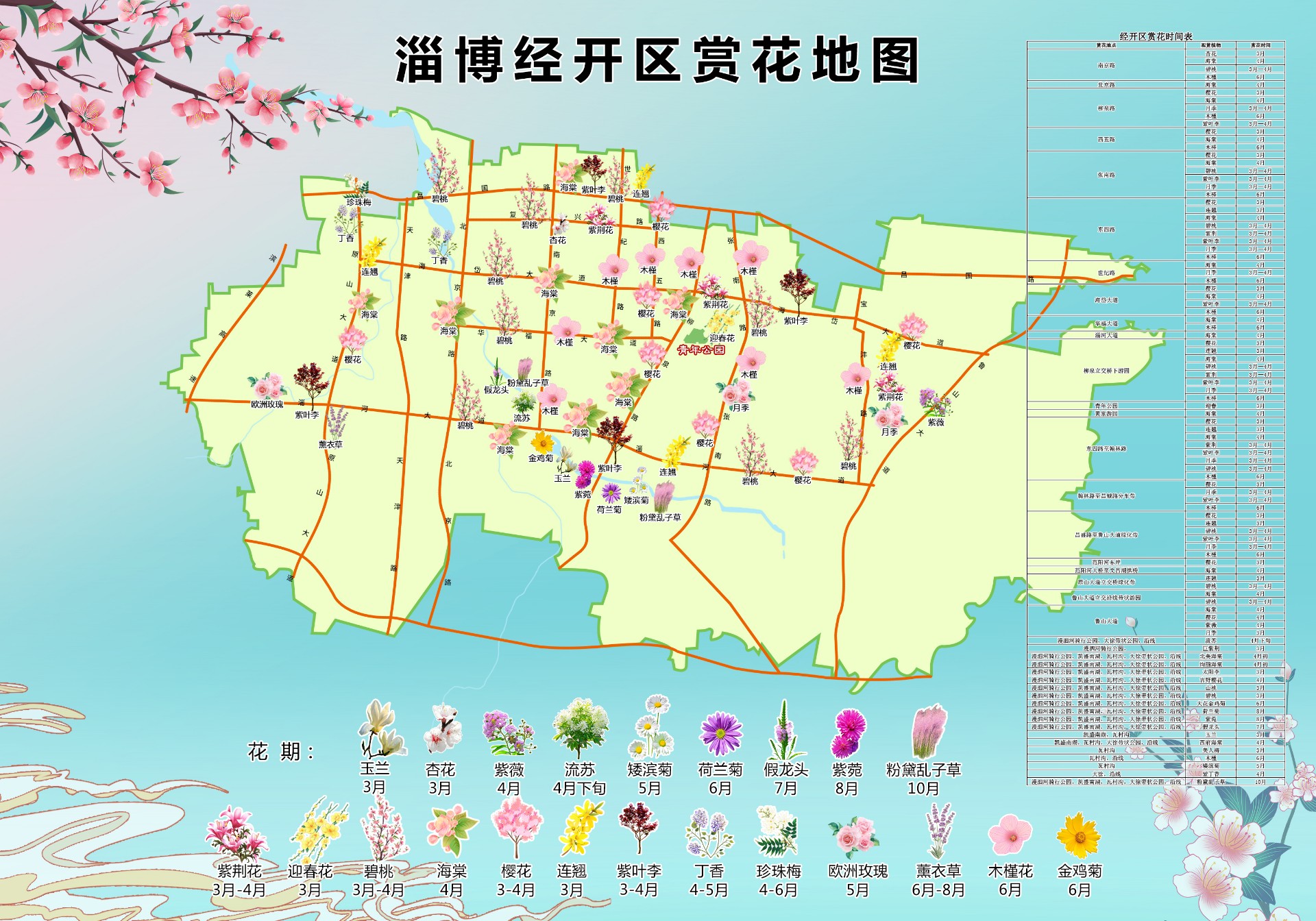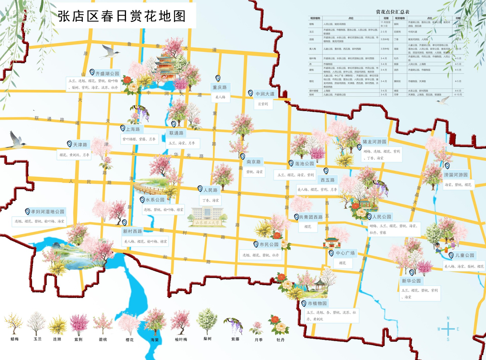 张店区:都市里的诗意花园。作为城市核心,张店区精选了齐盛湖公园、市民公园、儿童公园等22处赏花游园好去处。从湖畔的垂柳依依到园内的百花争艳,这里不仅有最佳观赏花期的贴心提示,更打造了“推窗见绿、出门入园”的城市生态客厅。