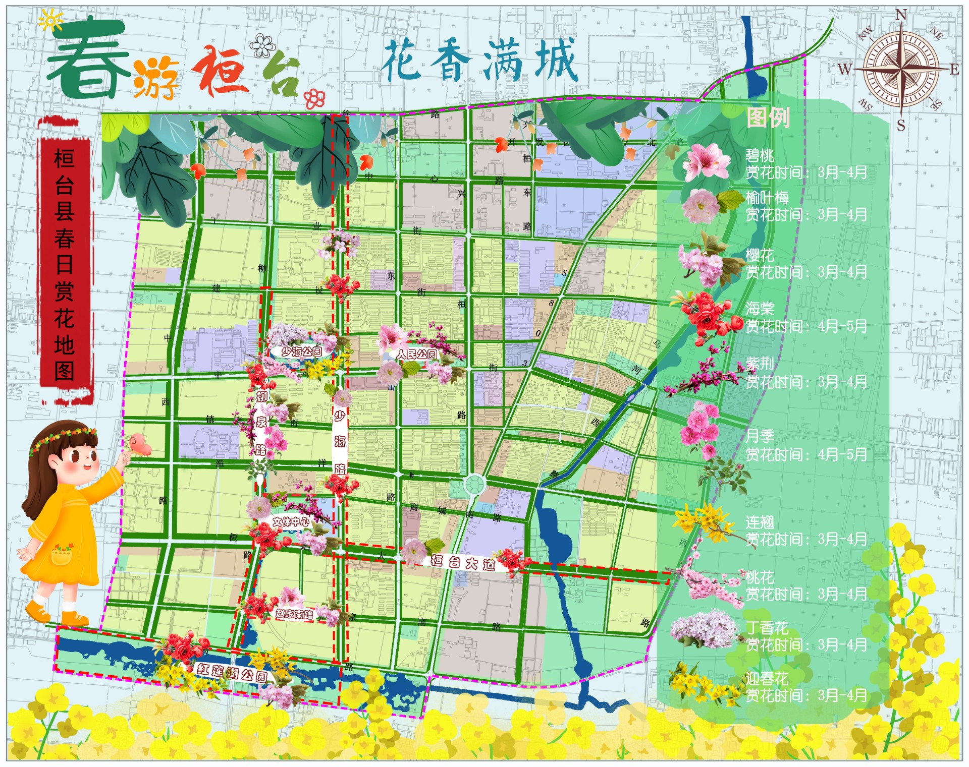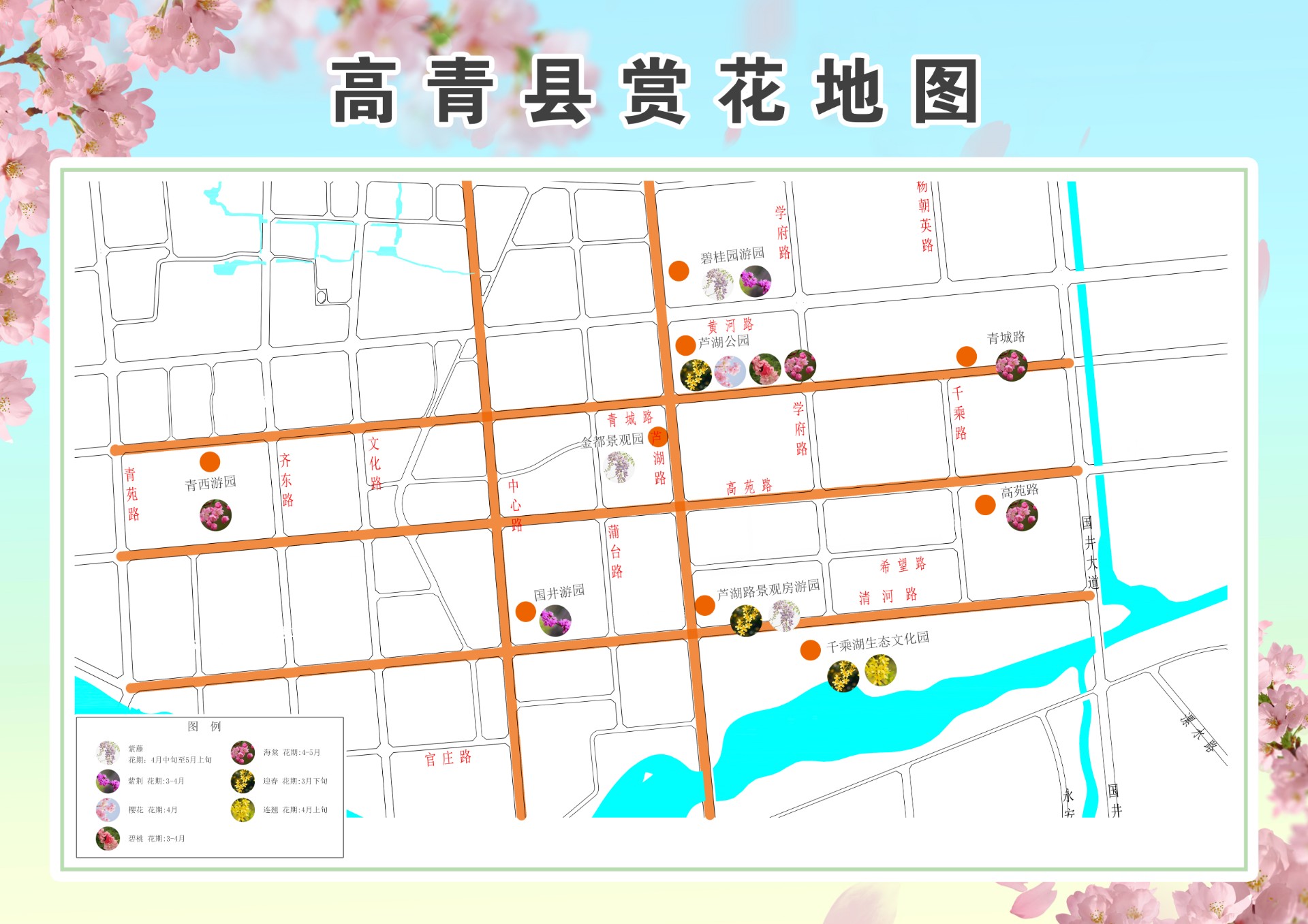 桓台县:江北水城,荷乡花语。虽然以荷花闻名,但春日的桓台同样精彩。少海公园、红莲湖公园、文体中心等8处赏花地点,精选了碧桃、海棠、樱花等10种春花,红莲湖畔,花树照水,波光潋滟。