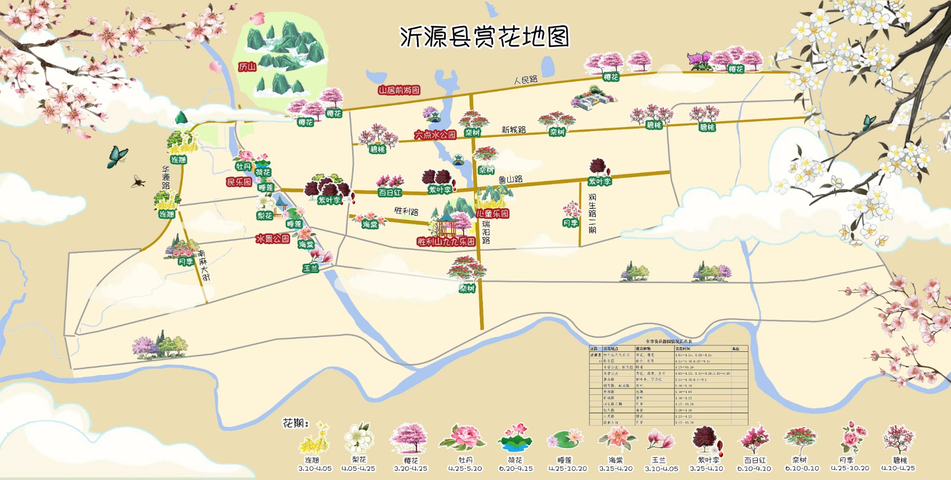 沂源县:沂蒙山下,果香花浓。作为林果大县,沂源县在民乐园、胜利山九九公园、六点水公园等7处点位,精选连翘、梨花、樱花、牡丹等12种植物。漫山遍野的梨花如雪,粉嫩的桃花似霞,构成了壮美的山地花海景观。