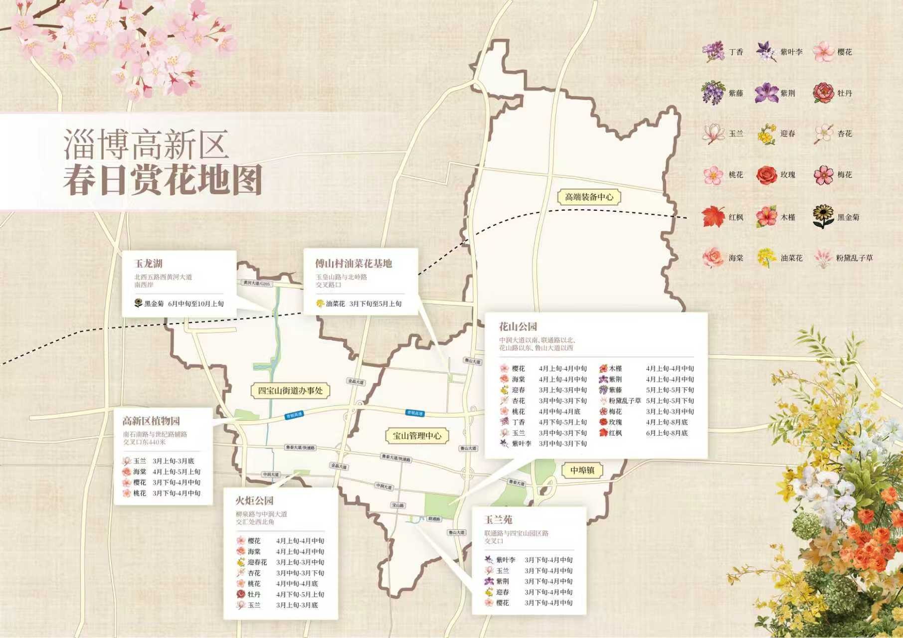 高新区:科技与自然的完美融合。高新区重点推介了火炬公园、花山公园、高新区植物园等6处点位,选取了牡丹、丁香、海棠、油菜花等20种最佳赏花植物。漫步其中,既能感受现代产业的脉搏,又能沉醉于田园花海的浪漫。