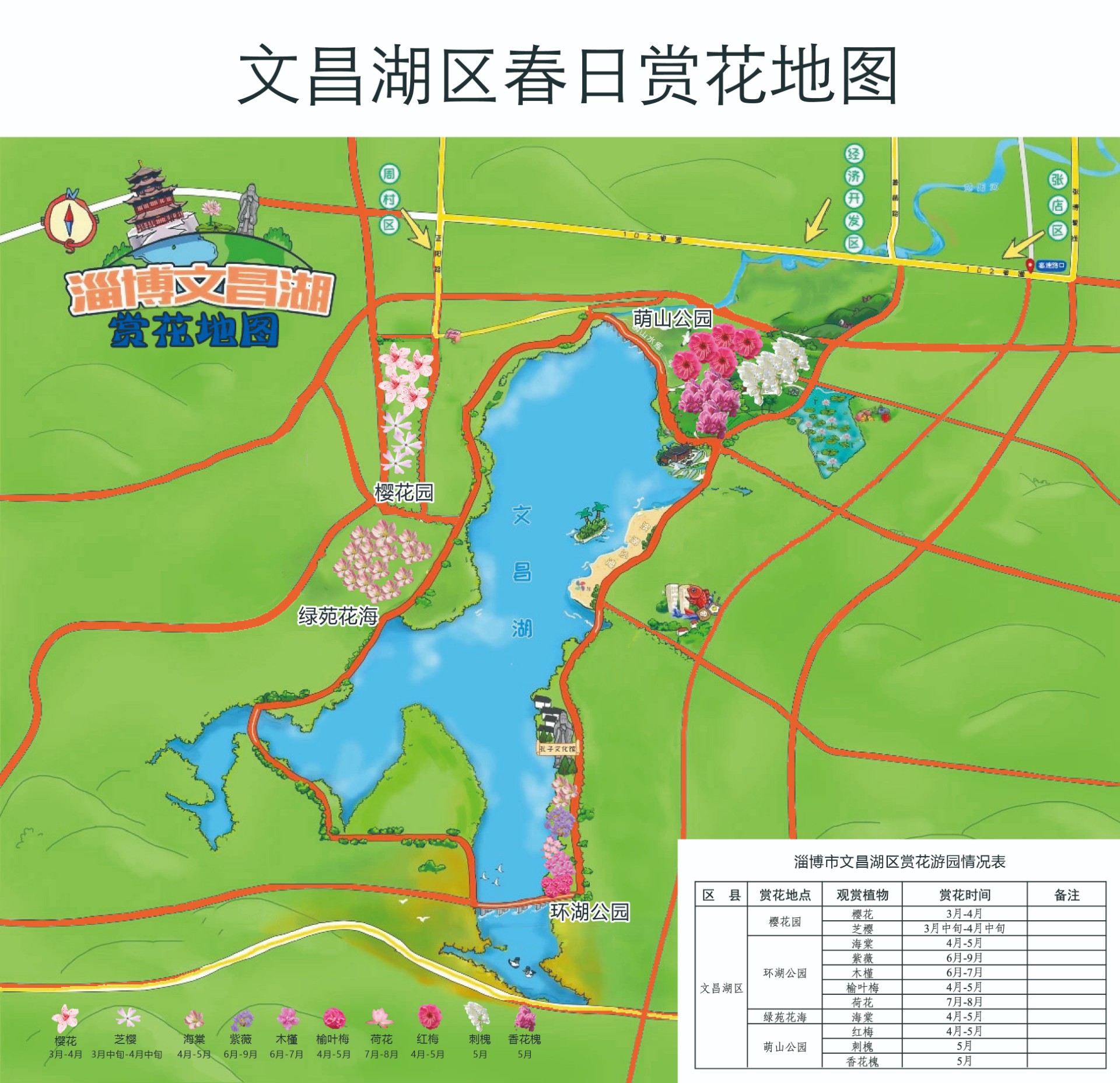 文昌湖区:齐鲁第一湖,水上花园。文昌湖区在萌山公园、樱花园等4处点位,选取了樱花、海棠、紫薇、红梅等10种植物。环湖路旁,花树夹道,湖光山色与繁花相映成趣。