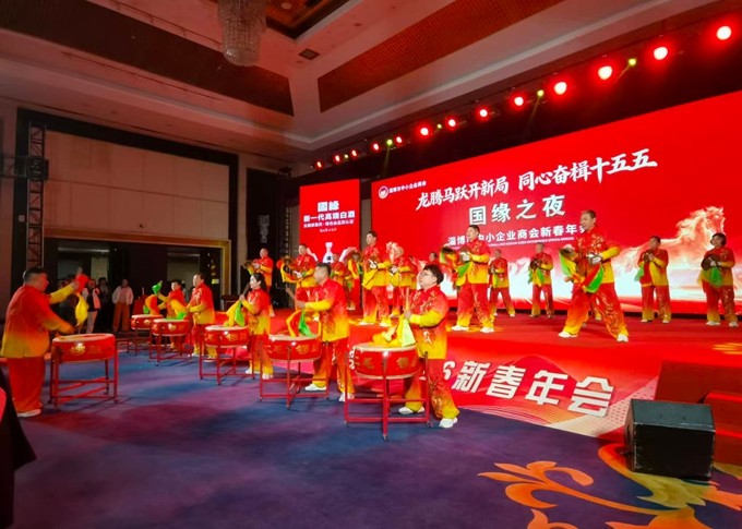 盛会在震撼的灯光秀《万马奔腾》中拉开帷幕,淄博二毛锣鼓队的《战鼓催春》擂响奋进节拍,淄博宝鑫新经典学校的孩子们表演的《中华美少年》舞动了青春的脚步,充满对马年的美好期许,更是淄博市中小企业勇毅前行的铿锵号角。独唱《不如见一面》、齐服表演、声乐《黄桑店》《淄博烧烤三年》《俺我淄博人》、舞蹈《金马奔腾》、温暖公益、民盟淄博市委赠送字画等节目令观众目不暇接,享尽艺术熏陶。全体会长共同合唱会歌《追梦路上》,让大家在歌声中感受到同心聚力的磅礴力量,把晚会推向高潮。