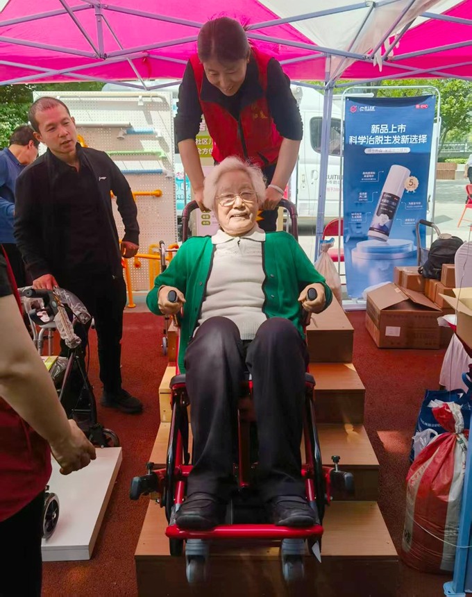 在市集北段,一群七八十岁的老人围拢在一台爬楼机前争相体验。该产品由淄川和美康养服务有限公司自行研制开发,具有电动代步协助老年人爬楼的功能,既能购买又能租赁使用,为上下楼不便的老年人带来了福音。
