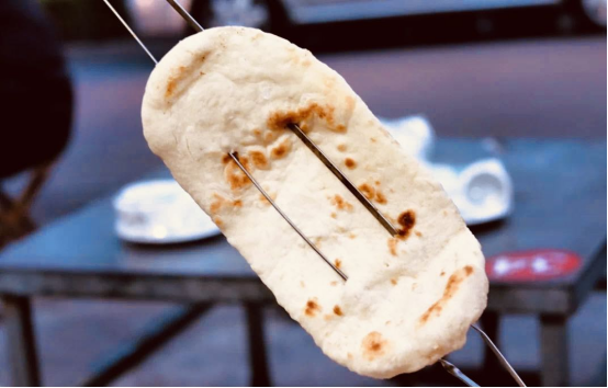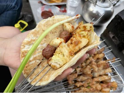 烤罢再用灵魂小饼把肉一裹,抹上甜面酱或辣酱,再加上山东人民喜爱的嫩葱,葱白微甜,葱绿味辛。小饼将肉串油脂吸尽,既能增饼之香气又能解肉之油腻,吃起来那叫一个香!