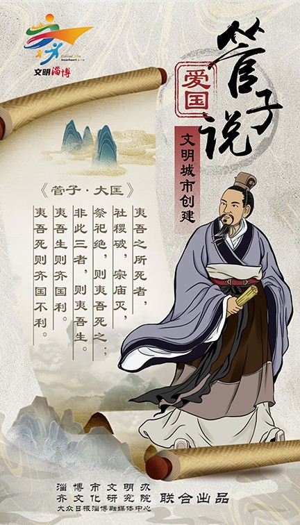 齐国政治家﹑思想家管仲在《管子·正世》记载:“不慕古,不留今,与时变,与俗化。”蕴含的“变革、创新”的元素与当今淄博改革、创新、开放、务实、包容和重工厚商、尊贤尚功的文化特质高度契合。自8月23日起,淄博市文明办将齐文化与新时代文明实践相结合,挖掘当地优秀传统文化的底蕴和人文特色,陆续推出20幅公益宣传海报《管子说》。海报援引管仲经典论述,对“爱国、诚信、公正、和谐”等社会主义核心价值观进行阐述,揭示出核心价值观与博大精深的中华优秀传统文化是一脉相承的,进一步引导全市广大党员干部、群众坚定文化自信,以文化高度自觉推动文明城市创建。