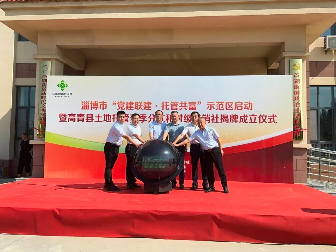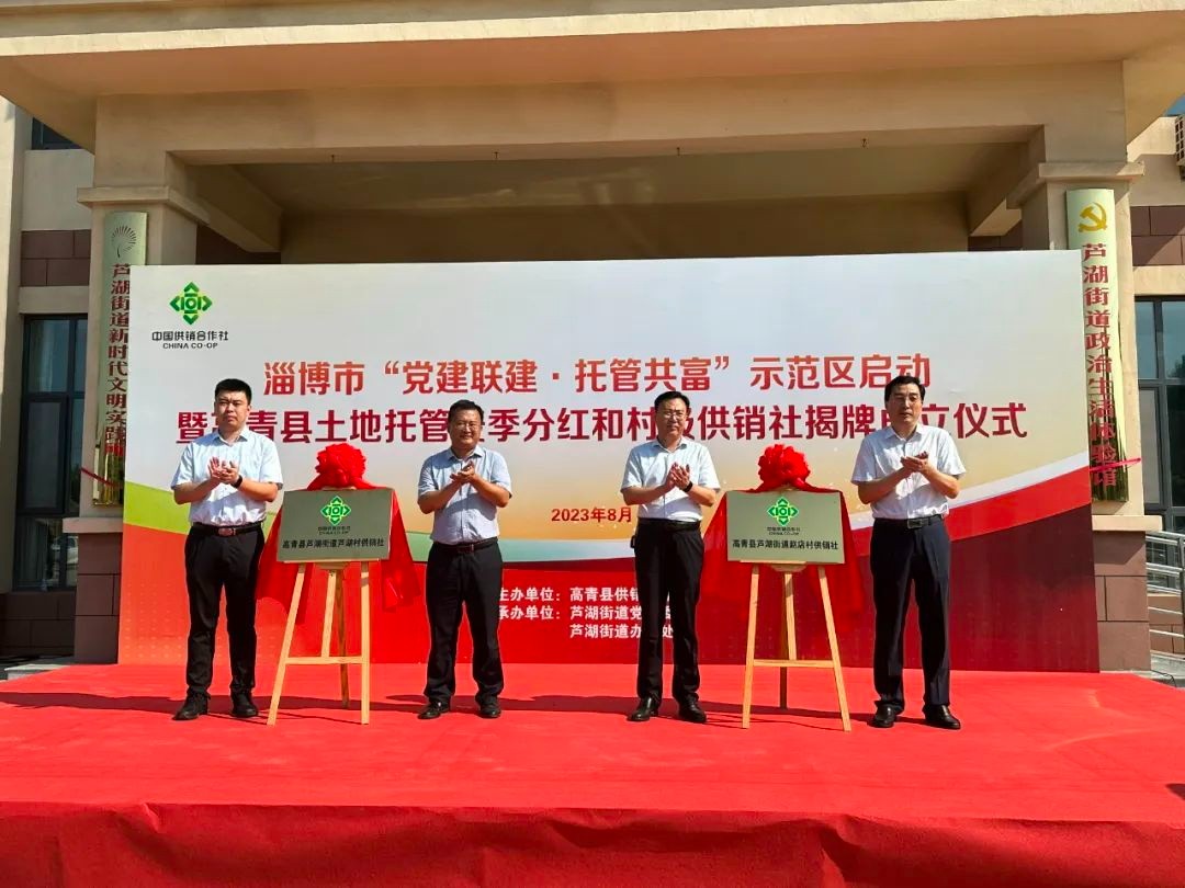 8月10日上午,高青县供销社联合芦湖街道举行淄博市“党建联建·托管共富”示范区启动暨高青县土地托管麦季分红和村级供销社揭牌成立仪式。山东供销现代农业发展集团有限公司董事长蒋庆增,淄博市供销社党委书记、理事会主任申佃军,市供销社党委委员、理事会副主任刘冀中,高青县政府副县长李永,高青县委组织部副部长张波参加活动,高青县供销社党委书记、主任王仕军主持。