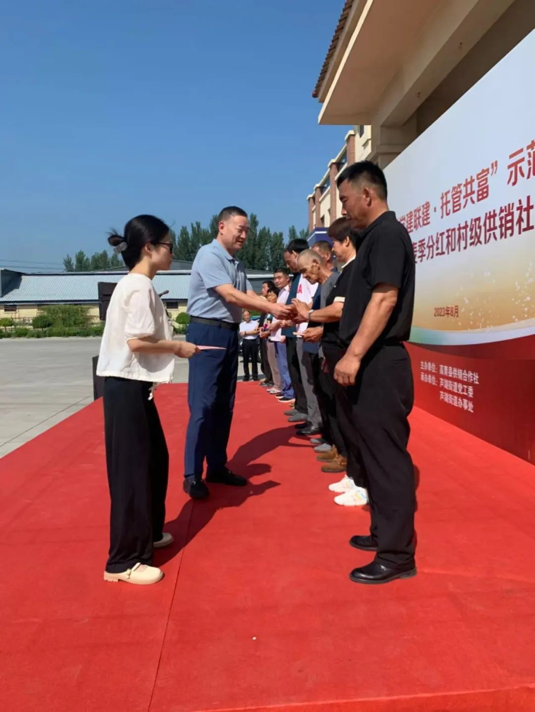 分红仪式结束后,与会领导共同启动全市首个“党建联动·托管共富”示范区并为全县首批村级供销社——赵店村供销社、芦湖村供销社揭牌。示范区的启动是以基层党建引领新型农村集体经济发展的创新探索,充分发挥基层党组织的战斗堡垒作用,支撑全县农业社会化服务高质量发展,助推集体增收、农民致富。同时,以全县首批村级供销社成立为起点,年内规划建设村级供销社10家,不断探索村级供销社发展的新路径,依托供销社流通渠道资源优势,推动村集体发展与农民更紧密结合,建强基层组织体系。