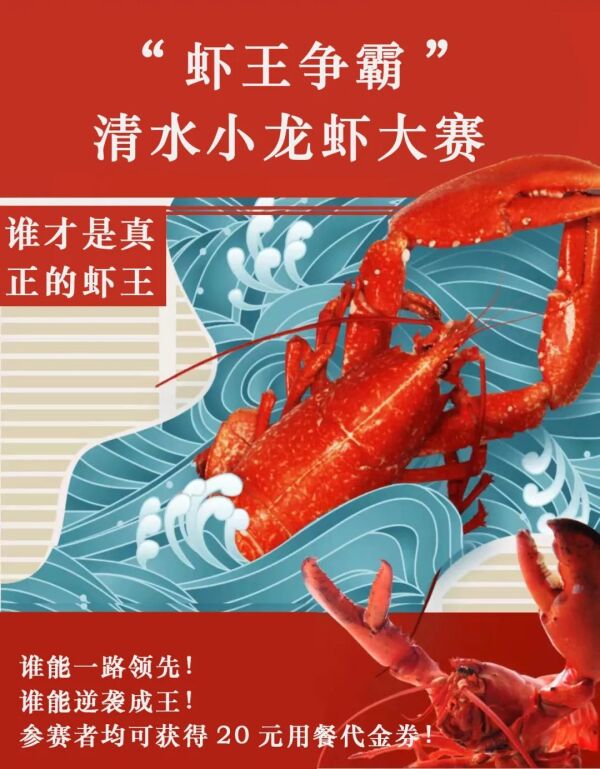内容:组织全县较大规模小龙虾养殖户,选出长势最好的龙虾参赛,分为长度(单只总长)和重量(20只总重)两个组别进行比赛,获得“虾王”称号可获得奖品和代金券,参赛者均可获得龙虾体验馆用餐优惠。