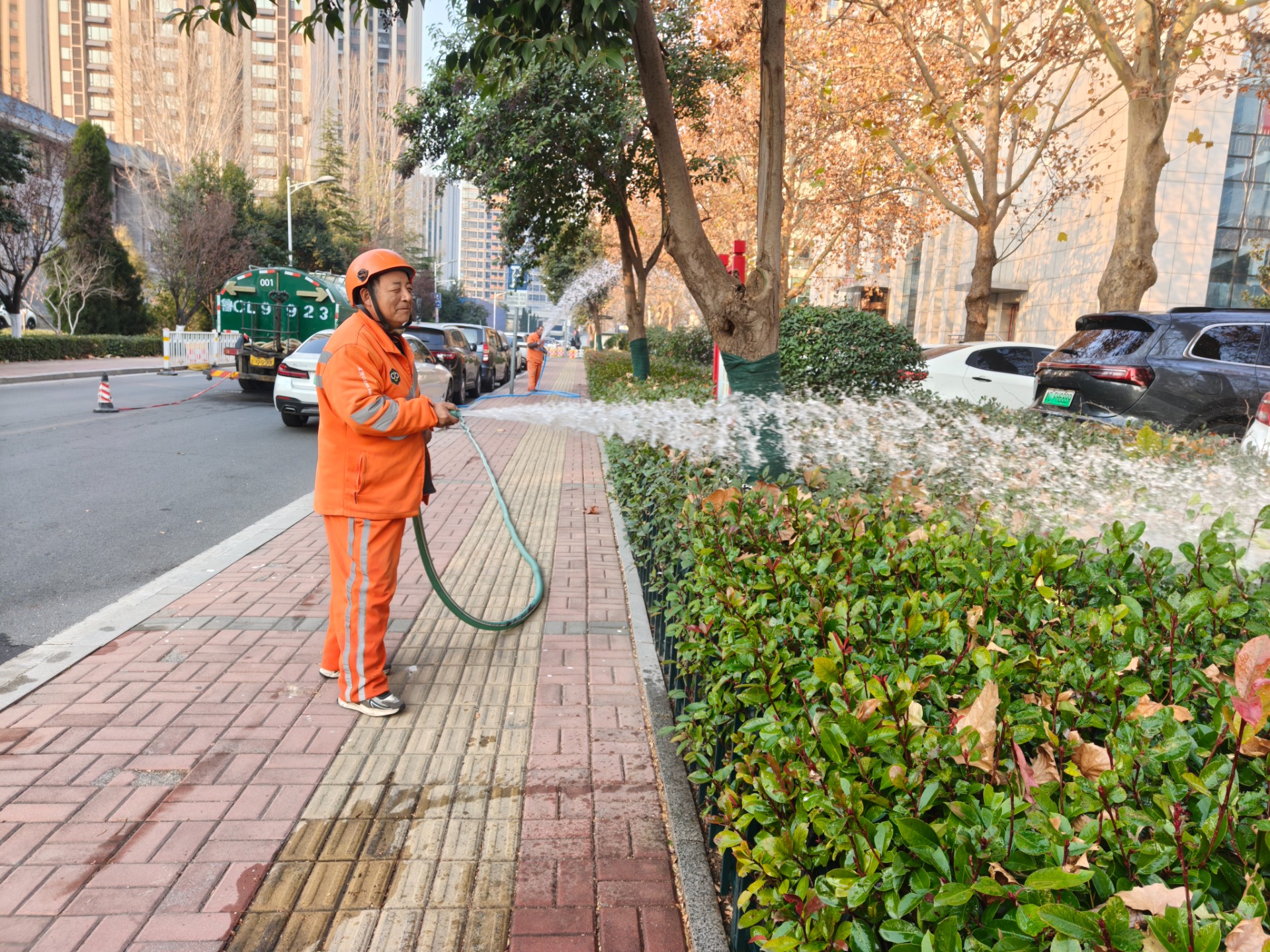 浇足越冬水,筑牢抗寒根基。采取分片包干有效办法,借助洒水车、水管等工具,全力确保每株苗木充分汲取“越冬水”。稳定地温,缓冲冻害。利用水比热容大的特点,浇透土壤能形成冰面冻土保护层。保护层下土壤温度不再继续下降,防止苗木根系被冻伤。补水保墒,缓解“冬旱”。让土壤储足水分,起到防冻抗旱作用,进而为苗木安全越冬筑牢坚实基础,有利于来年植物发芽返青。截至目前,辖区内超过30%的绿化区域已完成浇冬水工作,剩余部分在寒潮来临前全面完成。