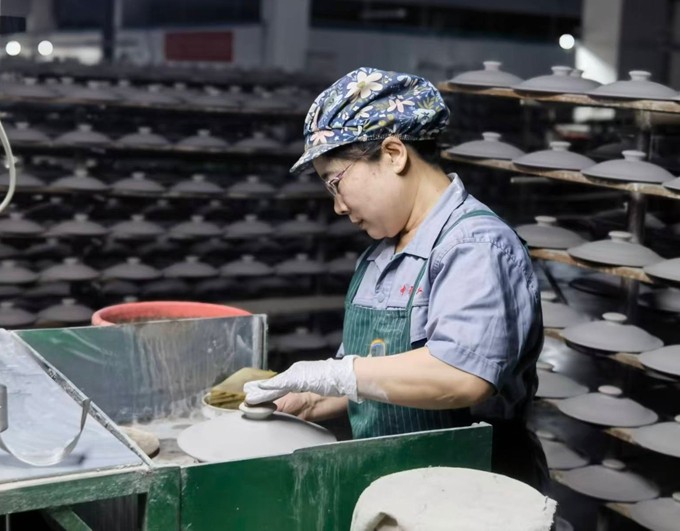 曹立杰从修坯工干起,工作时间有15年,2024年获得“中强工匠”称号。她深有体会地说:“干好一名修坯工,就要对每一件产品精雕细琢,做到精益求精。还要自觉地承担起下道工序就是上道工序‘检验官’的职责,没有高度负责的精神绝对干不好工作。”为此,她首先对上道工序送来的待修毛坯,做好修坯前检查,及时提醒上道工序调整或改进压模作业工艺,避免浪费更多的工时和材料。由于她工作认真负责,技术熟练,生产效率保持稳定,每天都能顺利完成360个以上的八寸鸡盅盖修坯定额,月工资7000元左右。她对这份收入非常满意。