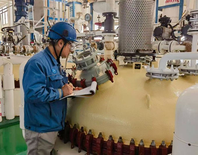记者来到六车间,此处是一座溶剂精馏塔,也是一个典型的环保车间,它由几个工段组成。作为水处理岗位,生产车间出来的合成母液,经过精馏塔提纯回收后,再出来的MVR蒸水,就可以实现达标排放。同时分离出来的盐,可以作为副产品出售,从而达到了清洁化生产模式。
