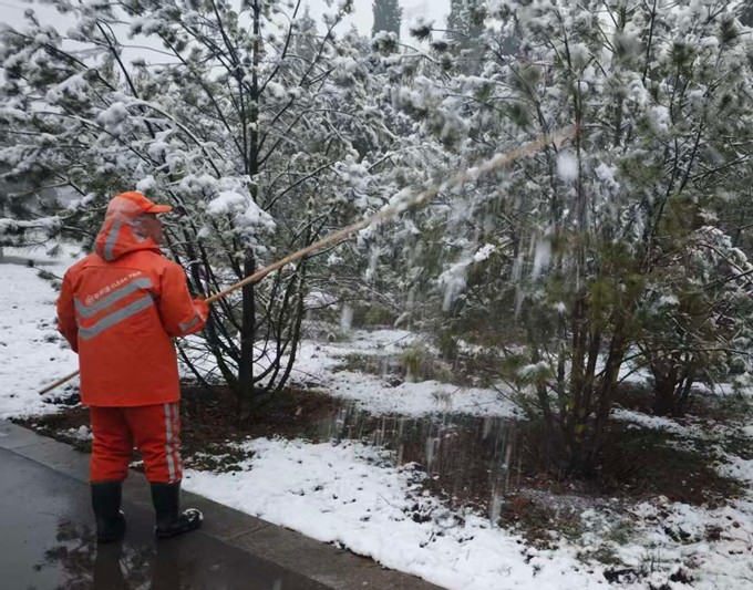 本次降雪期间,路面温度较高,辖区路面未形成明显积雪,淄博中环洁第一时间组织园林作业人员全员上岗,聚焦园林绿化养护与游园安全保障两大重点,将苗木积雪清理作为首要任务,防范积雪对苗木生长造成损害。作业人员对辖区树木开展全面积雪清理,重点对松柏球类苗木枝头积雪进行轻轻拍打,有效减轻积雪对枝条的重压,防止枝条弯折、断裂,切实保障苗木正常生长。