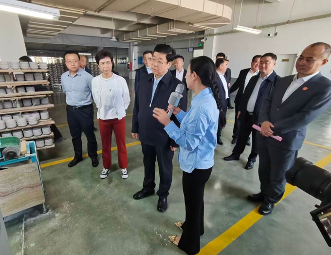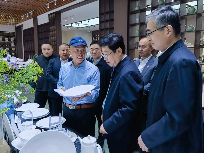 在产品展厅,考察团一行不断地和工作人员交流市场销售情况,问询销售价格,看着琳琅满目的中强瓷业产品,目不暇接,仿佛走进了一个“摔不烂的陶瓷”王国。交流中,考察团一行了解到葛本祥是40年前从吉林交流到淄博工作的“特殊人才”经历后,大家倍感亲切。
