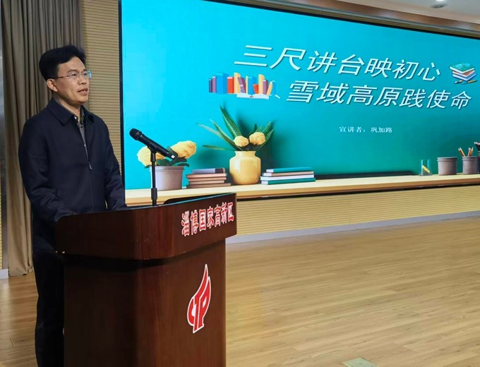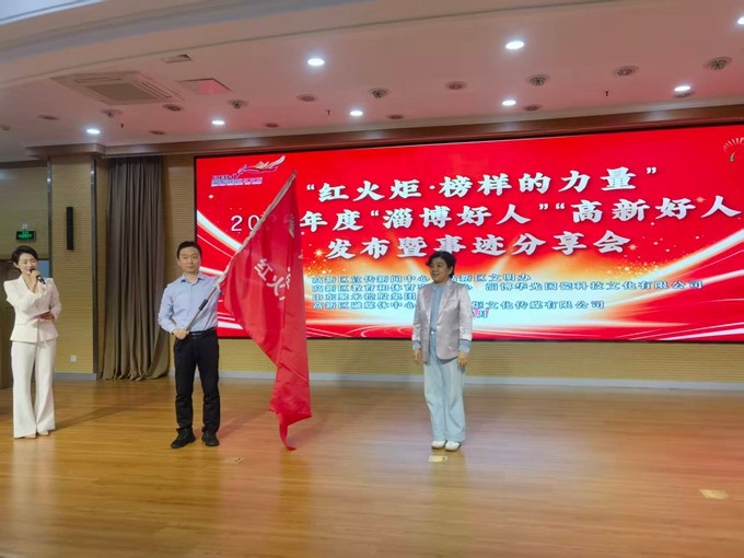 淄博高新区工委委员、工委管委会办公室主任王飞讲话,淄博高新区宣传新闻中心主任宋卫授旗并宣布“红火炬·高新好人宣讲团”成立。