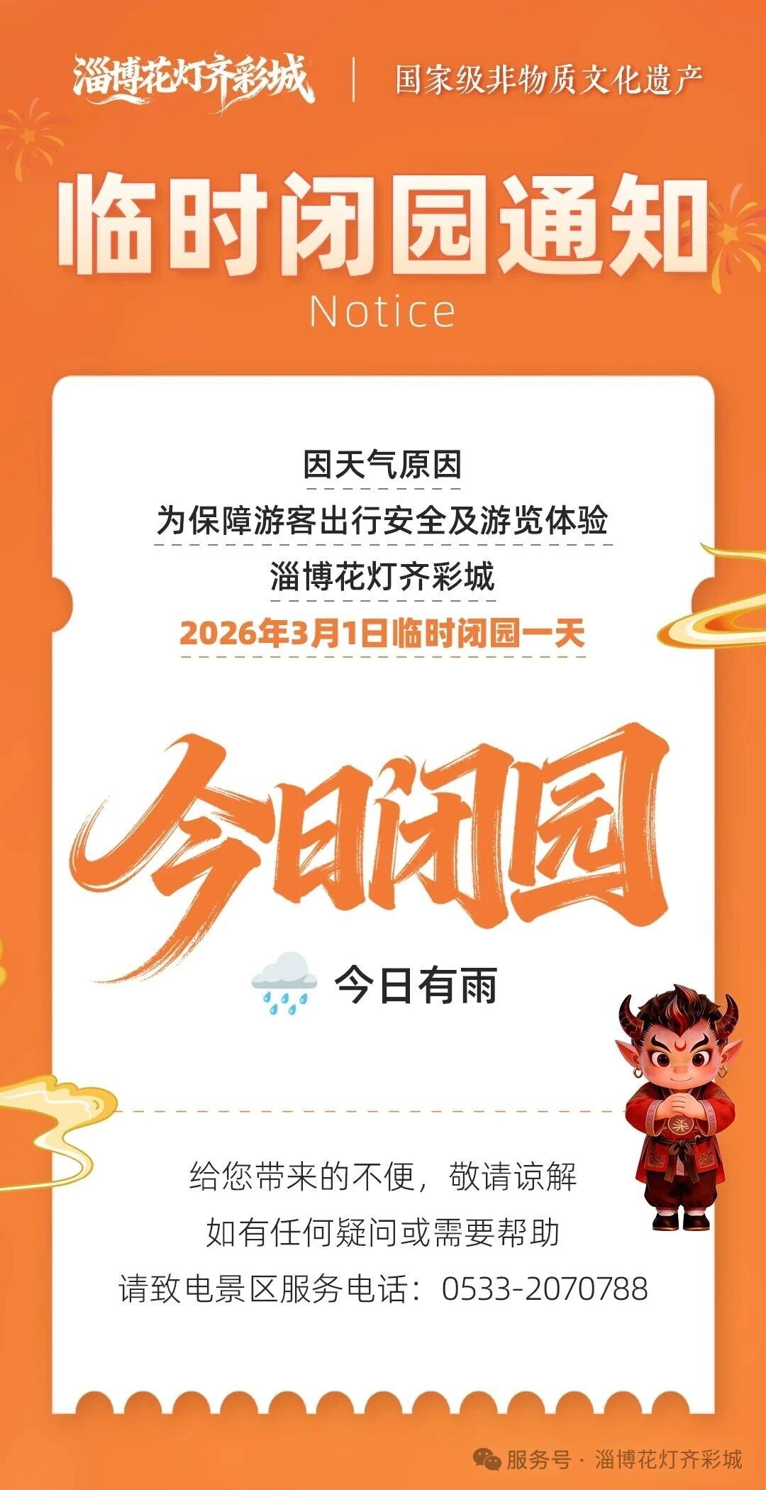 临时闭园通知!因天气原因,淄博花灯齐彩城2026年3月1日临时闭园一天
